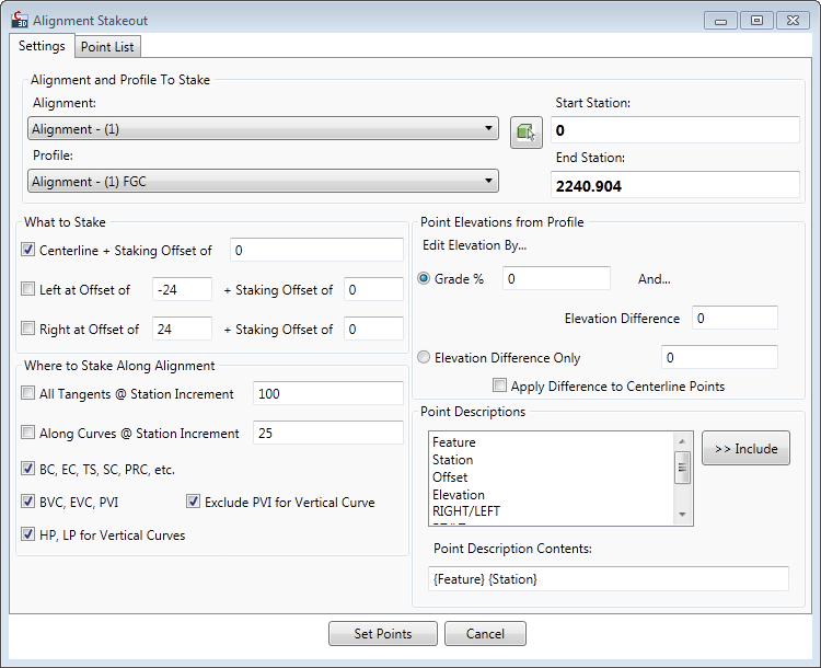 Alignment staking creates Civil 3D points for your alignment based key geometry. These points can be used for reports, used in the drawing or in the field.