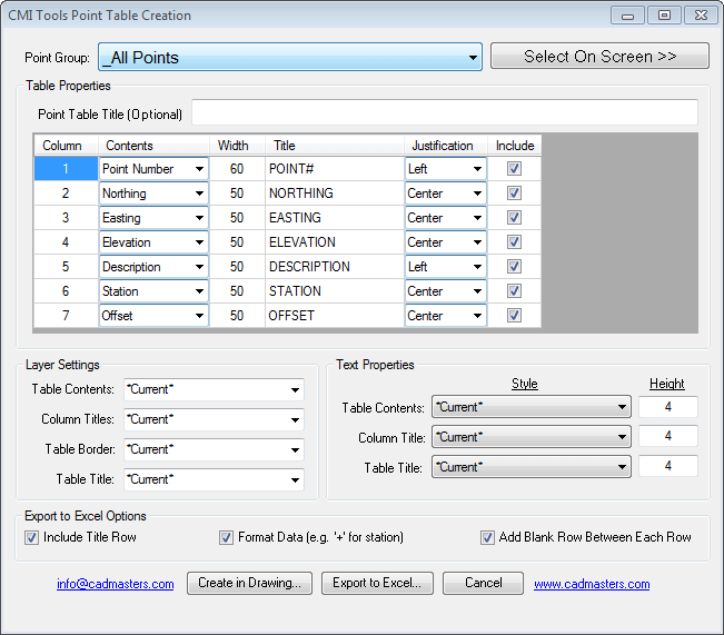 Create a table within your AutoCAD drawing that shows point information – northing, easting, elevation, description. You can even include stations and offsets to a reference alignment: