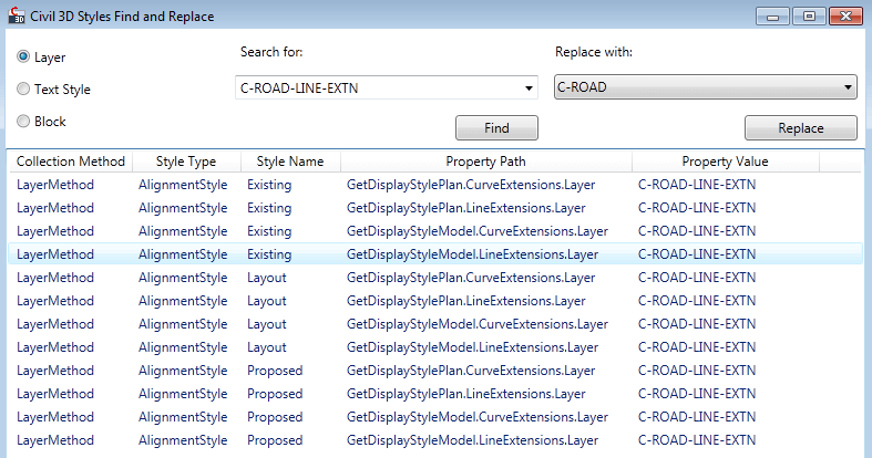 This routine will allow you to search all Civil 3D styles in a drawing for a particular layer, text style, or block.  You can also replace the layer, text style, or block as desired.